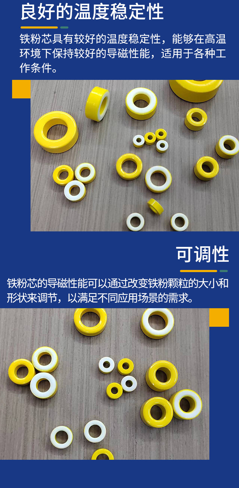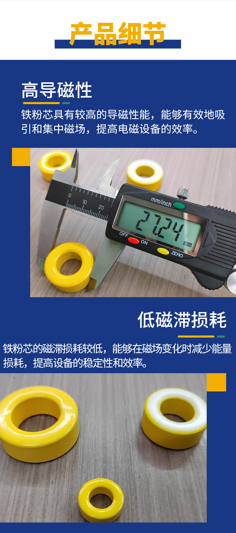 产品简介:铁粉芯是比较常见的一种软磁材料,也是目前市场价格比较低的材料之一。这种材料由碳基铁磁粉及树脂碳基铁磁粉构成,由于价格低廉,铁粉芯至今仍然是用量较大的磁粉芯,磁导率为10-100之间。